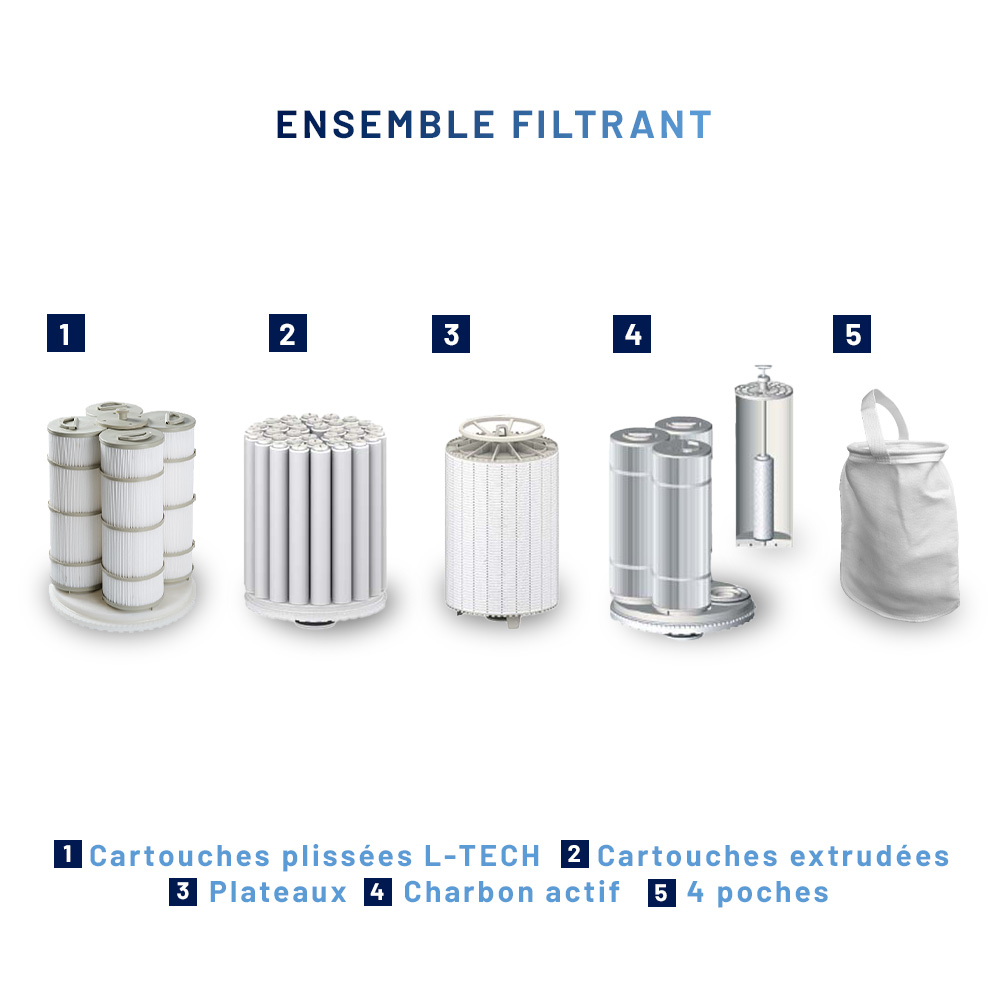 - L-TECH™ (cartouche plissée), QUALITHERM™ (cartouche extrudée), Plateaux filtrants, CARBONCANTECH™ (charbon actif)