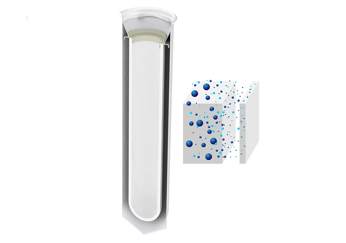 La partie interne de la poche est constituée d’un préfiltre PP meltblown rigide forte épaisseur de 10 mm. Ce préfiltre à porosité dégressive possède une capacité de rétention 4 à 10 fois supérieure par rapport aux filtres standards tout en éliminant les traces d’huile présentent dans les liquides.