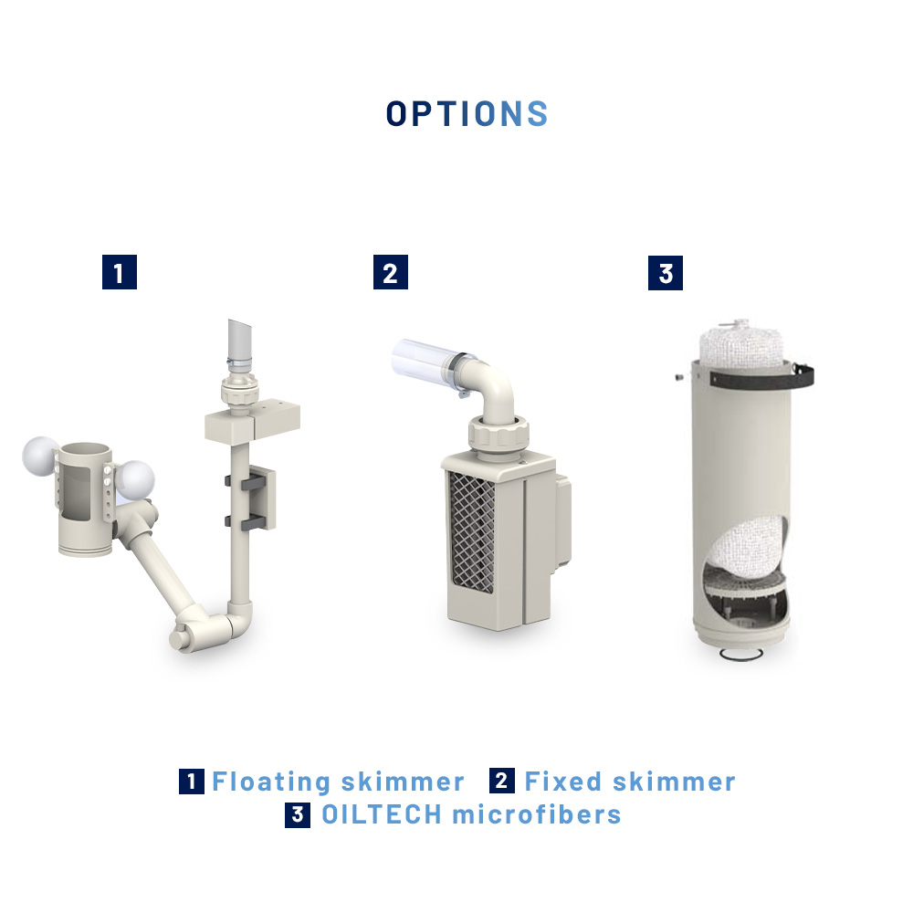 I filtri della SERIE H sono derivati dalla SERIE L. Al posto dei tradizionali mezzi di filtrazione, sono dotati di un sacchetto in microfibra di polipropilene OILTECH™ per assorbire gli oli presenti nel liquido. Un carico di 500 g raccoglie 6 litri di olio! Inoltre, i disoleatori sono dotati di uno schiumatoio - galleggiante o fisso - per aspirare l'olio in superficie.